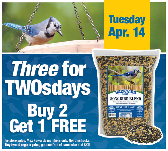 Welcome to The Wild Bird Market at CountryMax. To save you money, we’re offering Max Rewards members a weekly in-store deal no one else can – buy 2 get 1 FREE! Visit your nearest store every Tuesday and see why we’re #1 for backyard bird fans!