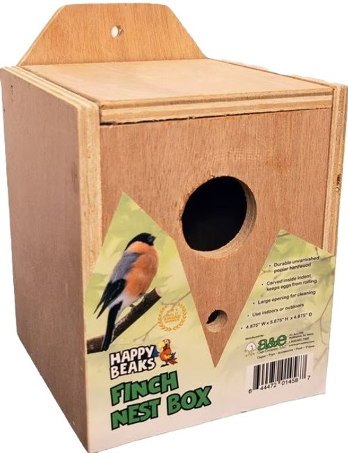 A&E Nest Box Finch is a sturdy and cozy home for your finches. Crafted from durable, unvarnished poplar hardwood, it features a carved indent inside to keep eggs from rolling. A large opening makes cleaning and monitoring easy, while the included perch and hanging hardware let you attach it effortlessly to the side of a cage. Suitable for both indoor and outdoor use, this nest box provides a safe and comfortable spot for your feathered friends.