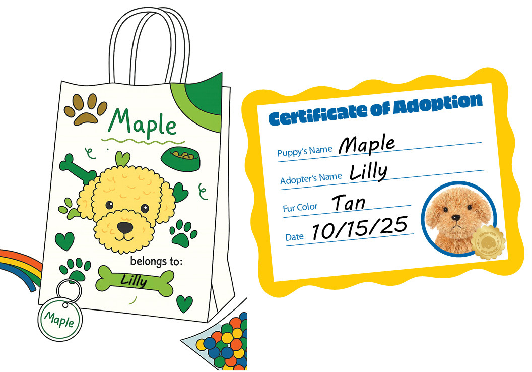 A stuffed dog with adoption certificates for each kid, carrying cases to decorate, a fun collar making craft, and a puppy training game. Plus 45 mintutes of unstructured time.
