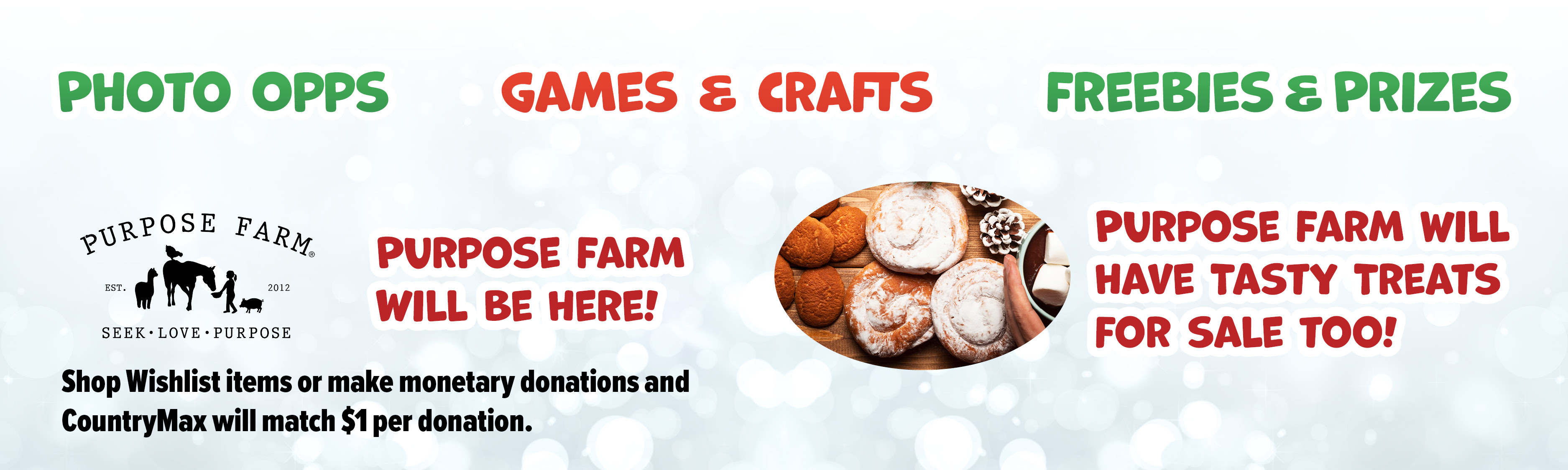 Join us for $5 holiday photos with Atlas the Farm Therapy Dog, farm-themed games, raffles, and a fun trivia trail for candy cane prizes. Enjoy hot cocoa and cookies, make Christmas cards for the animals and volunteers, and help support Purpose Farm with every dollar spent.
