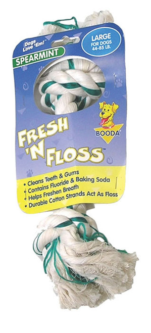 Booda Fresh N Floss 2 Knot Bone, Spearmint, will finally allow your dog to floss on their own! This one-of-a-kind rope combines durable cotton with mint-scented floss for a special twist on tug-of-war. It features fresh-tasting baking soda and wax coated nylon strands to help flight plaque and tartar control. As they chew and tug, the strands of yarn get in between their teeth and flosses to get rid of plaque and tartar.
