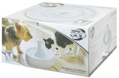 Fountain can be customized with the five interchangeable spout rings included with each fountain. Its quiet, submersible pump passes the water through an activated carbon filter to remove impurities before pumping it into the bowl. Flow control on top cap lets you easily adjust the speed of the water flow while unit is operating - no need to shut it off. To fill the unit, simply add more water to the bowl; maximum and minimum fill lines guide you. Great for multiple pet households. Holds 128 oz. One filter included. Filters should be changed every 2-4 weeks. Utilizes the same filtering technology as all Drinkwell fountains and constantly circulates water to inhibit bacteria.