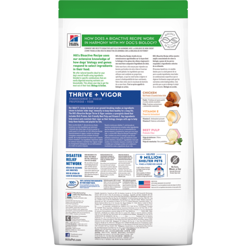 Hill's Bioactive Recipe Adult 7+ Thrive + Vigor Dog Food contains a synergistic blend that includes Rich Protein, Gut-Friendly Beet Pulp and Vitamin E