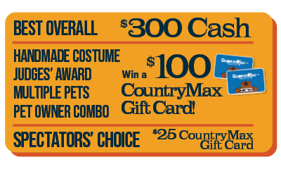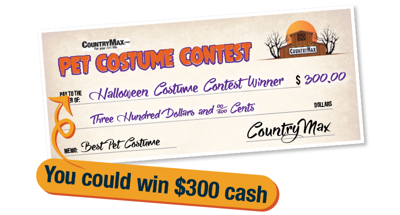 Join all the spooky fun. Enter your pet in our live Halloween costume contest. It’s free to register and you get a CountryMax tote filled with pet goodies and coupons.