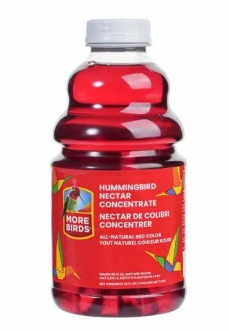Bring hungry hummingbirds to your yard with More Birds® Red Ready-to-Use Hummingbird Nectar. At More Birds®, we believe in providing the best for our feathered friends. Our nectar is free from artificial dyes and flavors and has been carefully crafted to mimic the real flower nectar hummingbirds feed from in nature. Plus, the all-natural red color is derived from fruits and vegetables. Hummingbirds won’t be able to resist stopping by for a drink. Each concentrate bottle makes 96 fl oz of nectar, ensuring an ample supply to attract and nourish hummingbirds.