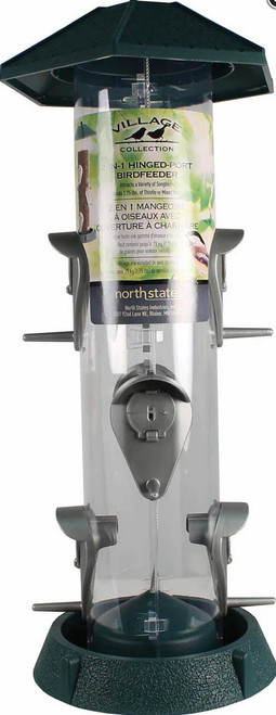 North States Village Collection 2-In-1 Hinged Port Bird Feeder, 1.75Lbs. Capacity is made of lightweight, weather resistant plastic. 6 dual-purpose hinged ports flip up for thistle feed and down for mixed seed. Fill through lift off raised shingl