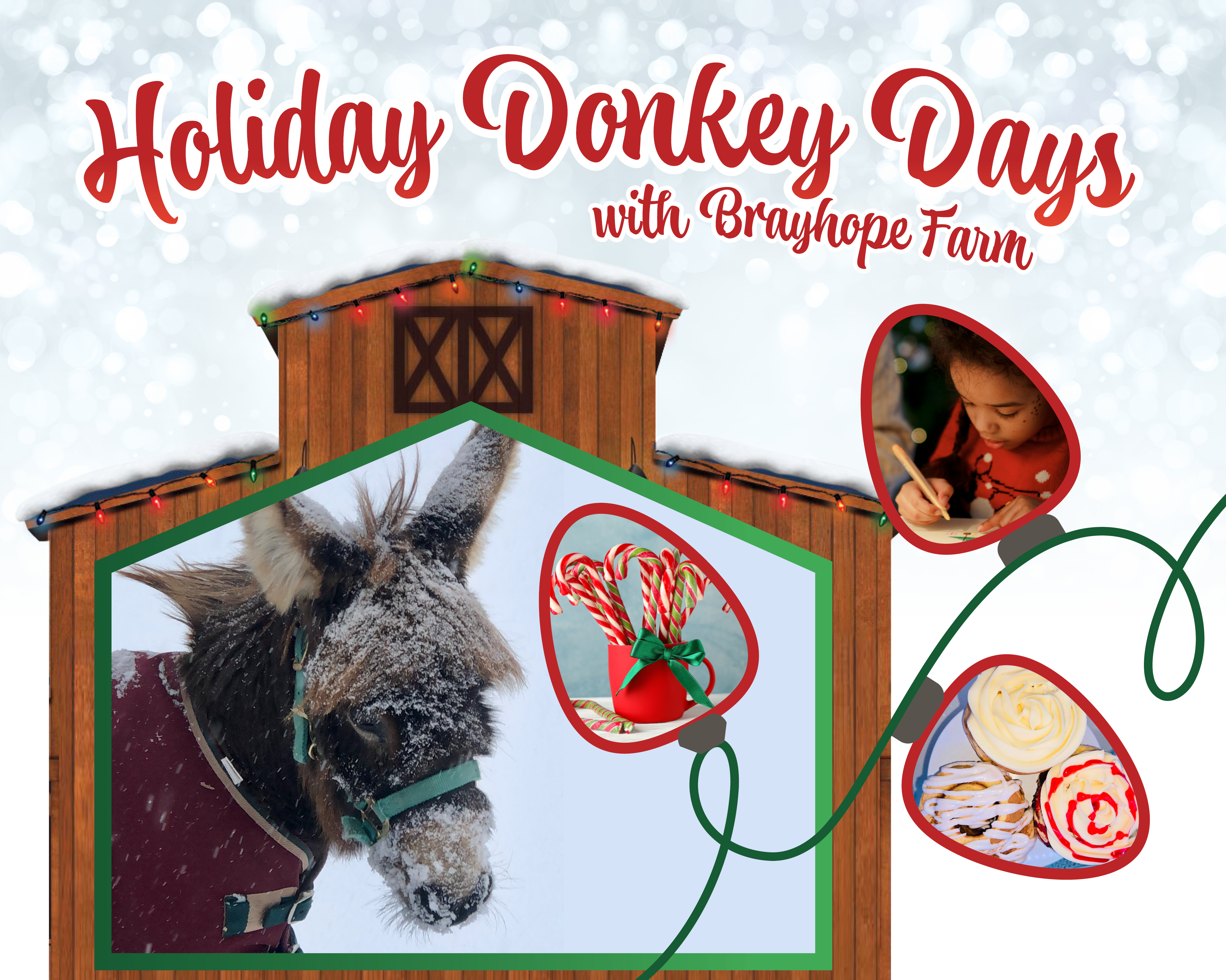 Bring the family to meet Brayhope’s donkeys in a holiday-themed photo pen, then stick around for farm games, trivia, and candy cane rewards. Make Christmas cards for the donkeys and volunteers while enjoying sweets, hot cocoa, and a chance to support Brayhope Farm.