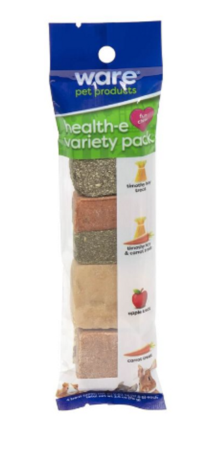 The Ware Health-E Variety Pack provides a healthy outlet for small animals with a variety of tantalizing textures to chew. Helps keep teeth clean and trimmed. Promotes healthy chewing behavior. Made with ground Timothy Hay, ground rice, compressed pine, loofs, raffia and jute rope